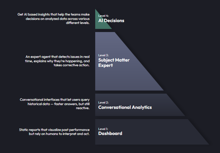 That gap is exactly where static analytics breaks down. A dashboard can highlight a KPI shift, but it usually can’t assemble the full story across business data, technical signals, operational context, and downstream workflows quickly enough to stop the loss.